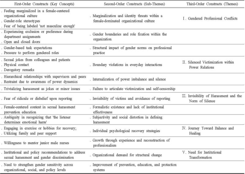 본 연구에서 질적 메타합성 연구방법을 이용하여 남자간호사의 성희롱 피해 경험을 통합한 결과, 젠더화된 전문성 충돌, 권력과 관계 속의 침묵된 피해, 피해의 비가시화와 침묵의 규범, 균형과 치유의 여정, 제도적 전환의 필요성이라는 다층적 의미가 형성되어 있었다.